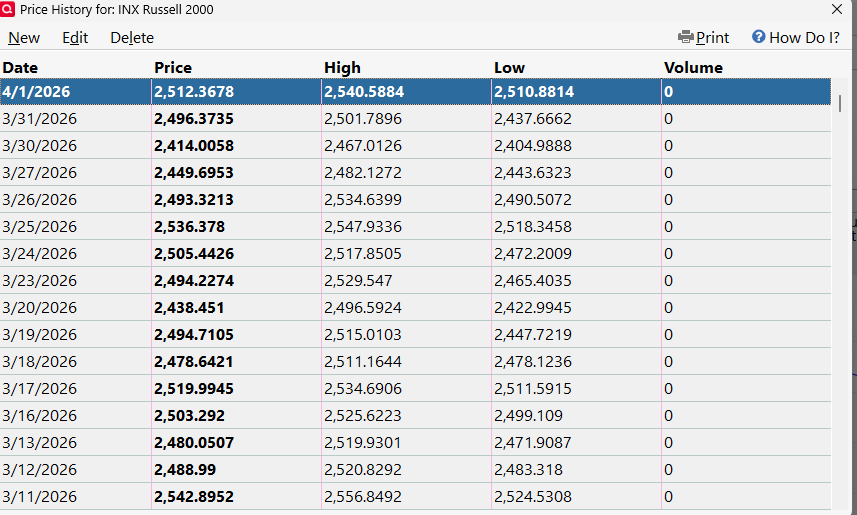 In my files, it is listed as "Russell 2000" with a Ticker Symbol of IUX. If I add a new security for the Russell 2000, it is listed as "RUSSELL 2000 INDEX" with a Symbol of INDEX:RUT. Both of these seem to work for me but they are not INDEX:IUT as listed in the OP.