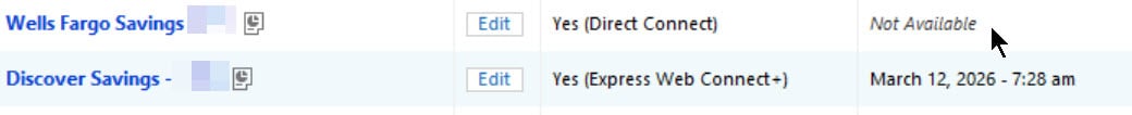 I have one Direct Connect account, Wells Fargo, and it's download results are no longer listed in the One Step Update Summary. Also, in the Account List window the Last Download column is not populated. However, the various Wells Fargo accounts I have are actually updated.