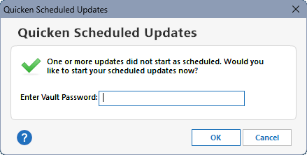 When you tell Quicken to schedule updates and specify to enter the password at Windows Startup, it's a guessing game where the password dialog (below) will show up: