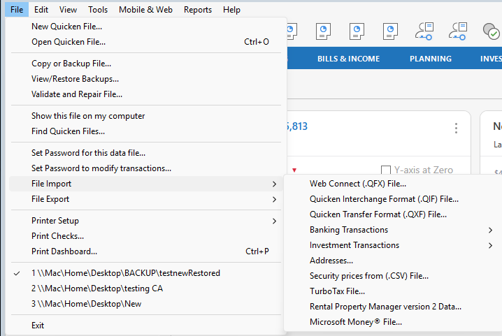Once the information is imported into your Quicken file, review the accounts to ensure everything looks correct. If it looks correct, then backup your Quicken file and connect your accounts.