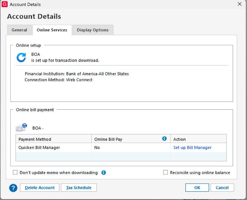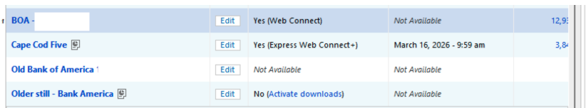 - I have been able to set up Express Web Connect+ for the two older Quicken Bank of America Accounts. I no longer use these, but cannot delete the data.
