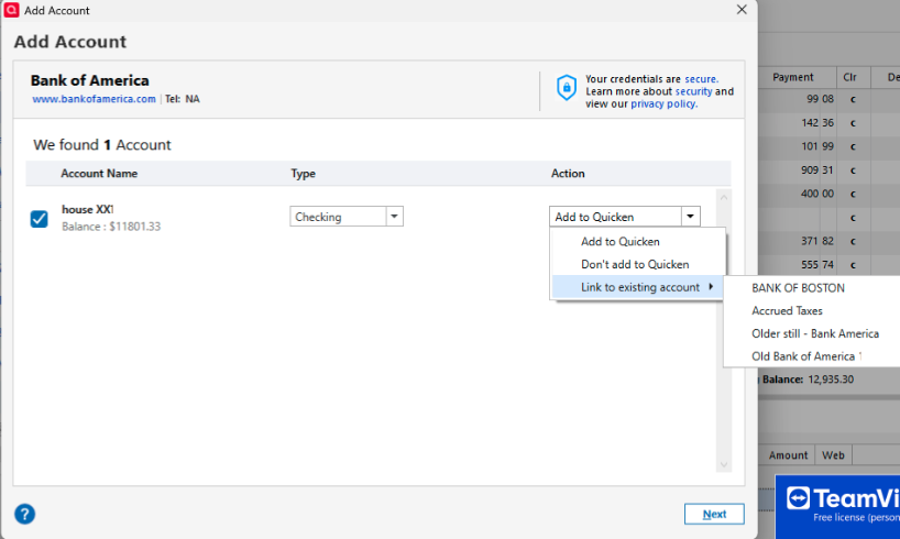 3. The Quicken account name BOA - XXXX-X does not show up as an option for an account to link to.