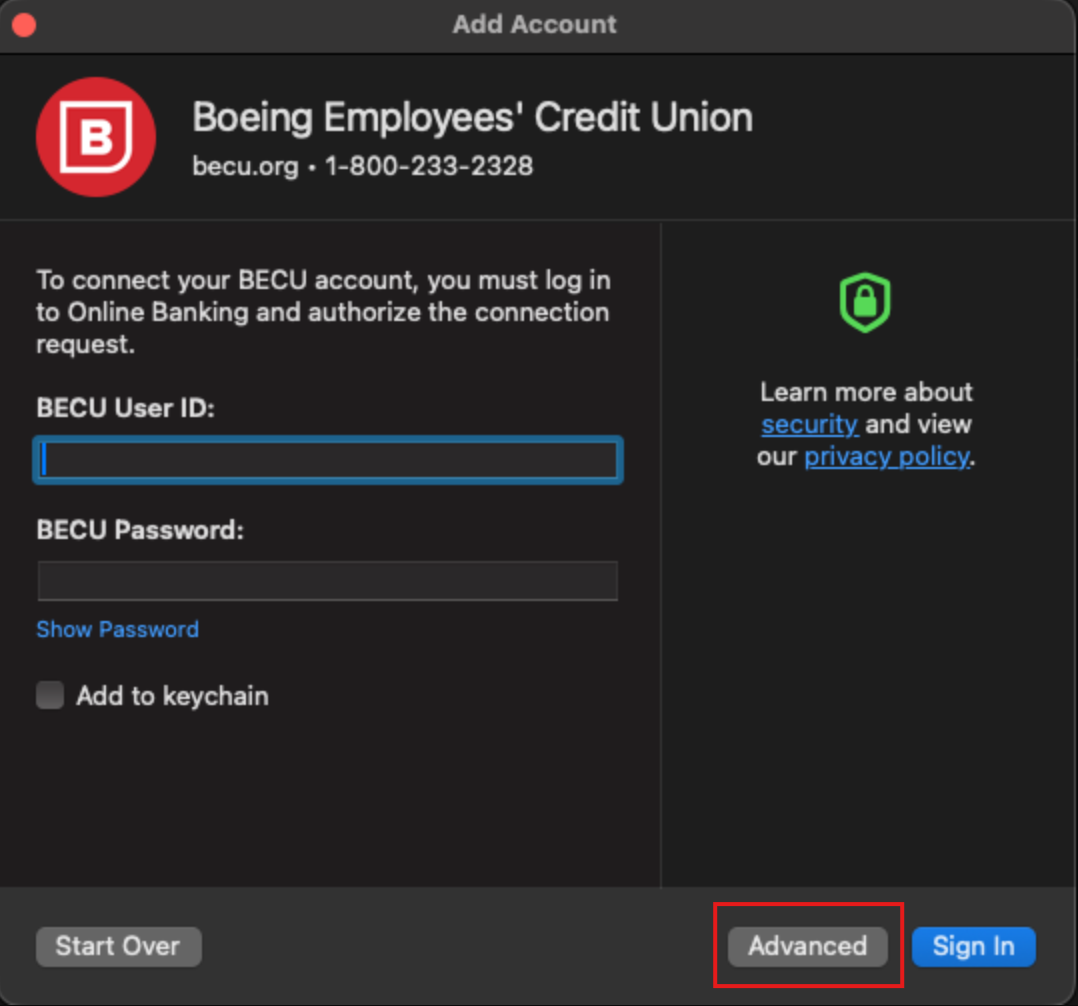 I am having the same issues with BECU and I'm also using Mac 8.5.1. I did the steps outlined above. When I tried to add the accounts back, I get "unexpected error occurred" that has Care Code: 16503.