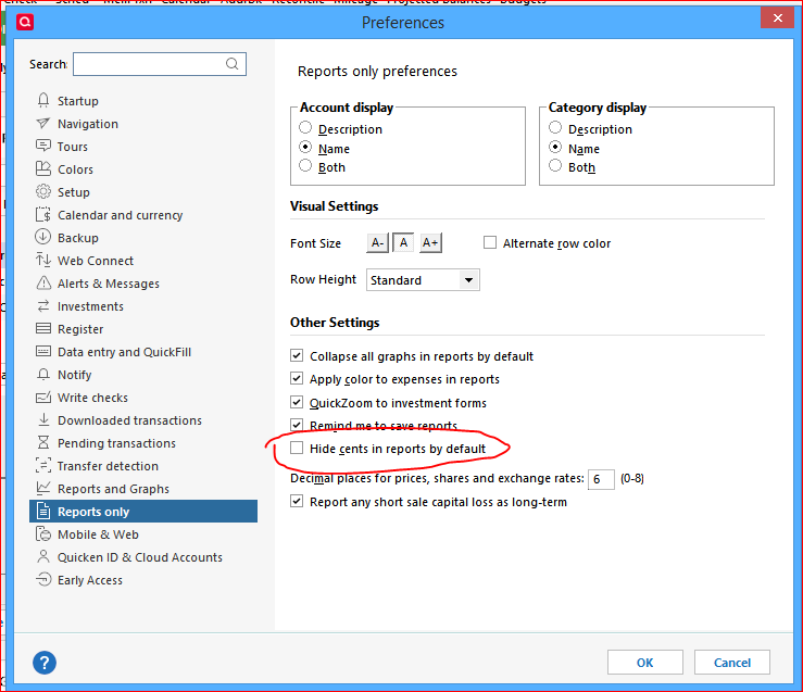 I have the cents turned off on my reports, (I went to the gear and uncheck "cents (not rounding)"), but the cents come back after I look at the detail of some categories. I go back to the gear and unckeck "cents" and have to save again. This is very frustrating.