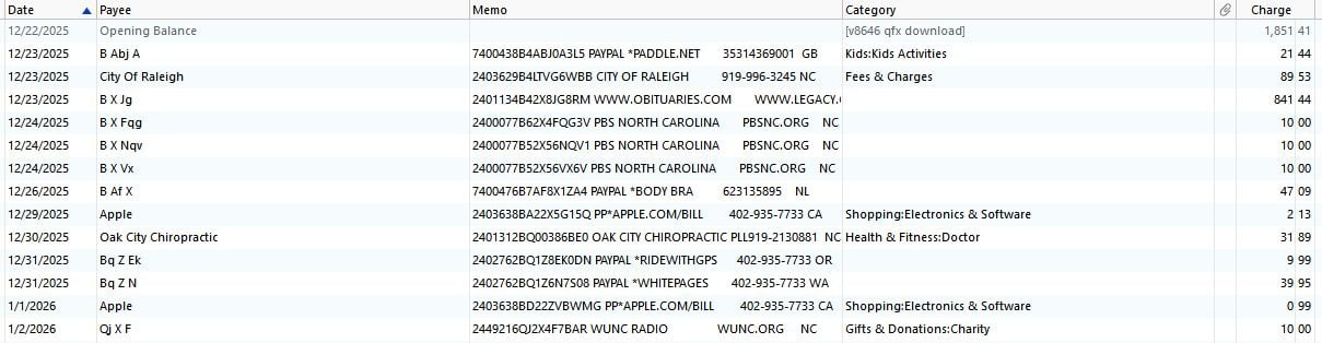 For a year, Coastal Credit Union has provided buggy QFX downloads. The name field, once imported, shows some of the unwanted code listed with Capitalized first letter and a few characters of the name. Nothing more. Not enough to make sense. The Memo field has the 17
