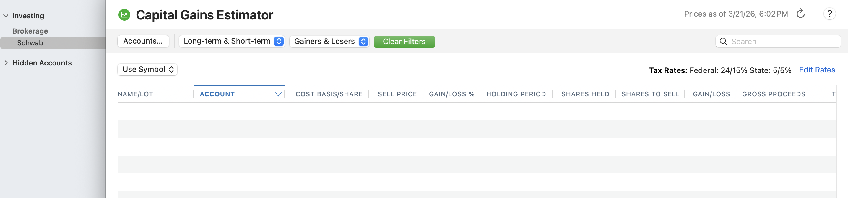 I just paid for a prorated update from Mac Classic to the premier version. I am trying to use the Capital Gains Calculator to figure get an estimate on taxes I'd owe. I have entered the federal and state tax rates. I have selected my Schwab account, chosen both short and long term returns and gainers and losers. I can't enter anything on the screen. The program doesn't draw the data from my Schwab account.