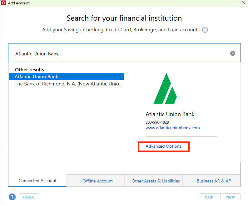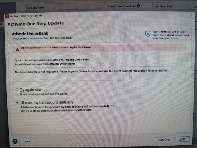 Recently opened a new account at Atlantic Union Bank. I'm able to download transactions into Quicken Classic when initiated from the bank side. Running the latest Windows