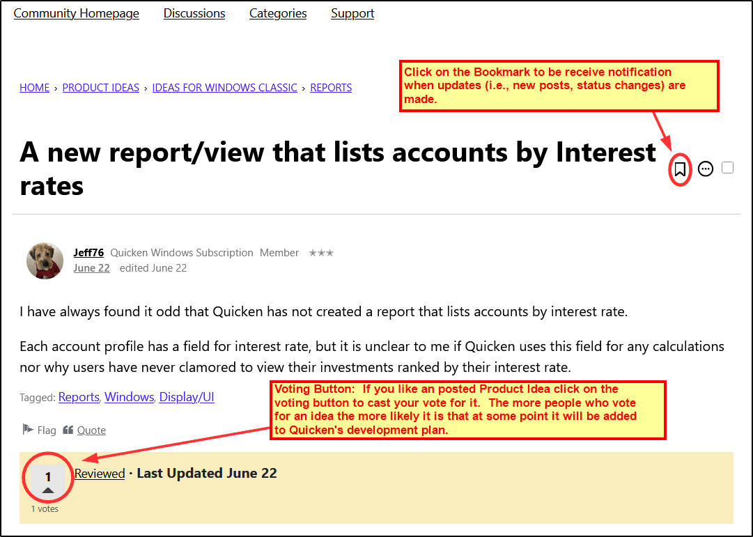 The more people who vote for an idea the more likely it will be that Quicken will add it to their development plan. To cast your vote for it see the example shown in this picture: