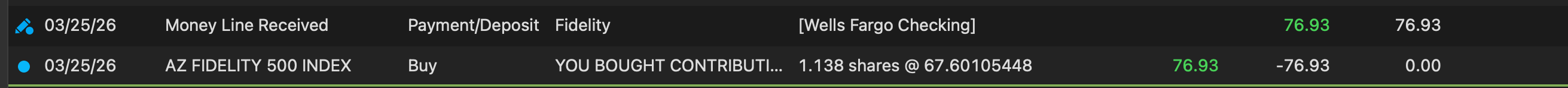 This one is the checking account side. The top two line items are the scheduled transactions. The bottom two line items are the ones that are automatically created by the Fidelity match when it matches against the Fidelity registers.