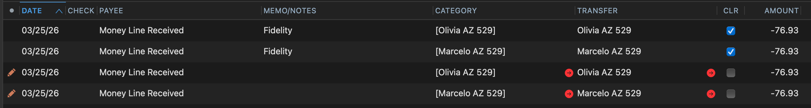 Here's an example of the Fidelity register with a perfect match, but which caused one of the dupes/red transfers above. Both registers for the 529 accounts look the same as this one.