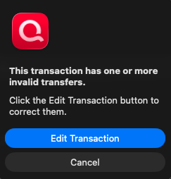 When you edit the transaction, or click the red arrow and the edit transaction button in the message that appears, are you able to see anything incorrect with the transfer category?