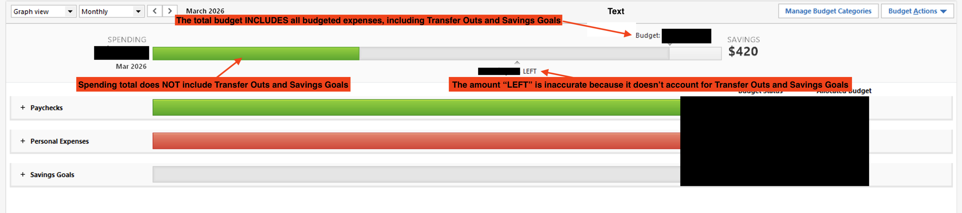 The Transfer Out accounts and Savings Goals are included in the "Budgeted Spending" numbers when I hover over the portion of the budget spending that's considered "savings" (where it shows "x savings = budgeted income - budgeted spending including reminders"). However, they are not included when I hover over the green/red bar that shows total spending making the amount "left" as completely inaccurate.