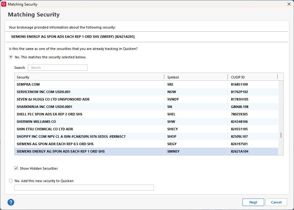 Today after Fidelity did some security changes, Quicken asked me if the Security names was the same as in the list or it needed to be added. In this case the Security name text was exactly the same as a previously one but the Security symbol was different. Since the symbol was different, I tried to add as a new security but it appears it only checks the text string. For this time I did alter the string by adding the Security symbol. Here is the exact issue.