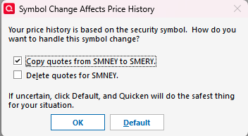 Just looked up the SMNEY symbol and it comes up as delisted. SMERY is an OTC stock. On the Quicken investing screen, the old symbol SMNEY is listed but the value shown is for the newer SMERY. On the Fidelity website, the security is the new SMERY.