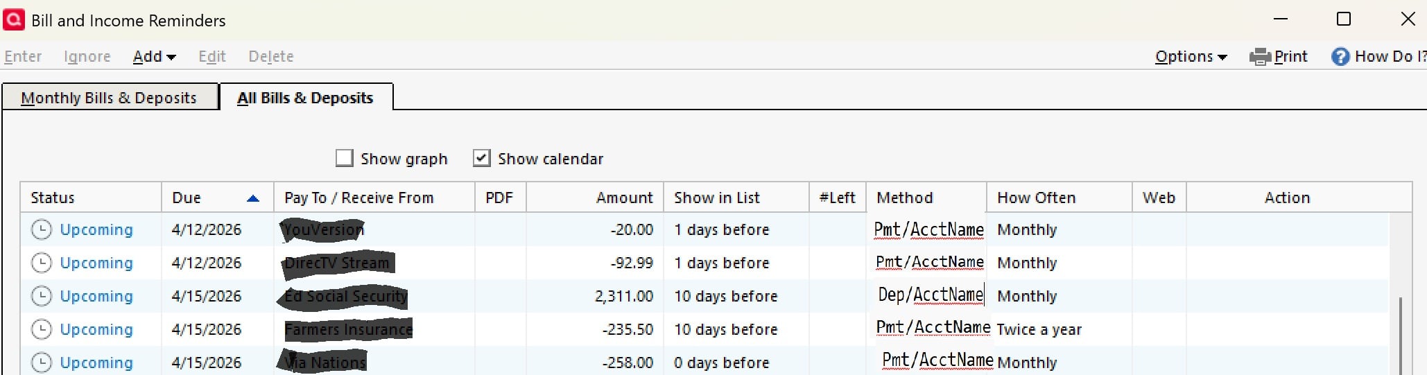 Add Account Column to Bill and Income Reminders Screen