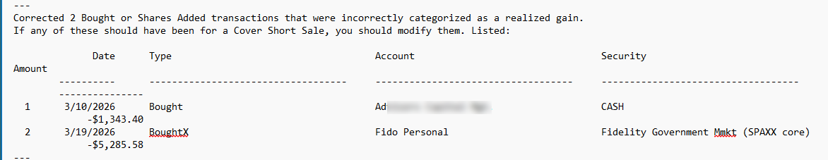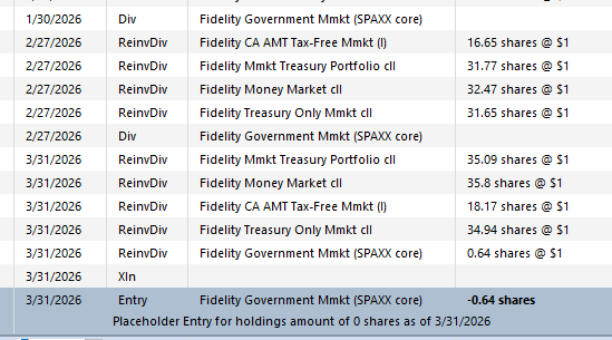 That account, like the others, was handling cash transactions correctly through February. However at the end of March it treated the SPAXX dividend as ReinvDiv; it should have been Div as before.