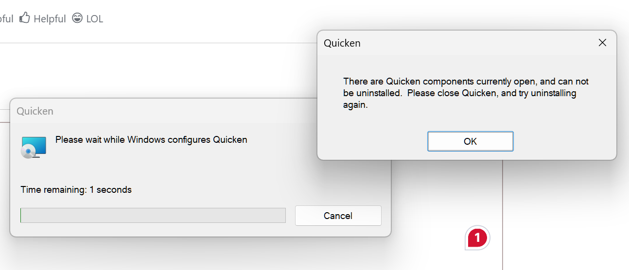 Thank you for letting us know you're seeing this issue. Make sure that your Quicken program is closed before uninstalling. If it is closed, and you're still seeing that error message, please restart your computer. That should force any open components to close.