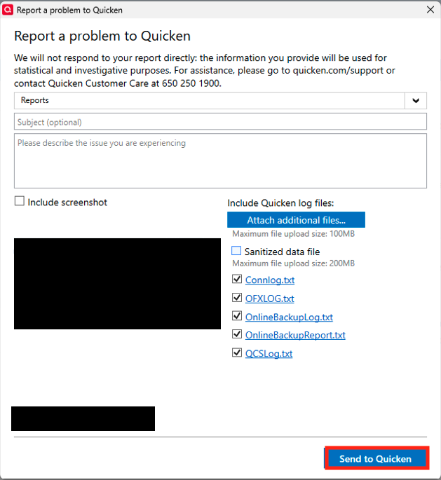 Once you do that, a pop-up window will appear. You’ll have the option to describe the issue. Also, make sure all the log files are selected, then click Send to Quicken.