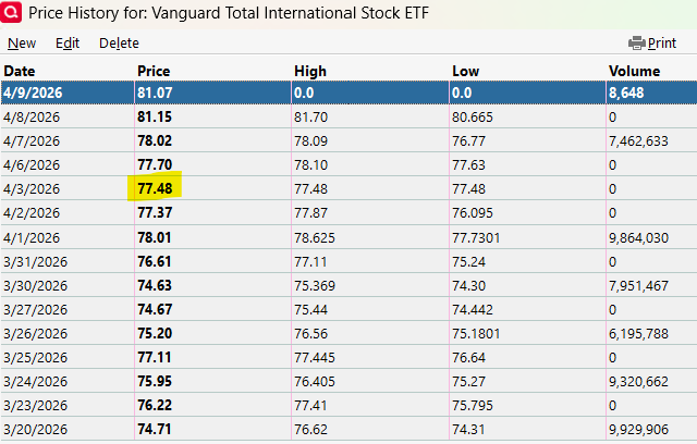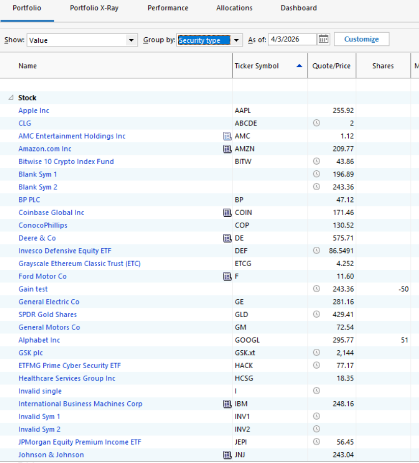 Normally I do not get quotes for days the markets were closed, but I ran a quick test on a test file where quotes had not been downloaded recently and I see that quotes as you describe (H=L=Close, Vol=0) WERE downloaded for 4/3, for individual stocks on my Watch List but not for ETFs or mutual funds. Here is a Portfolio View with the As Of date set to 4/3. In this chart, the securities without clocks in the Price column have entries in their price history.