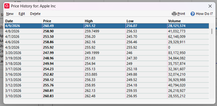 Here is the price history for AAPL in my test file. 255.92 was the 4/2 closing price. It appears that clicking on Update on a Portfolio page only downloaded the most recent 5 sessions. Maybe the issue is that if the market was closed 5 weekdays (or maybe 5 days) ago, it downloads the price from the previous session.
