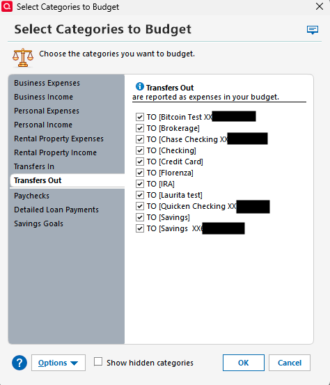 • Have you checked that all the categories you want to see are selected in Manage Budget Categories, including the accounts (for transfers)?