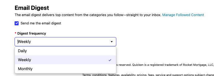 - Towards the bottom, you will see the Weekly Email Digest Settings, where you can opt in or out.