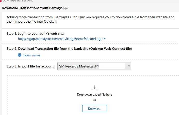 Thank you for contacting us about your AAdvantage Aviator Red World Elite Mastercard account.We acknowledged your concern regarding the issue you encountered while trying to access your transactions using Quicken. Barclays US credit card transaction downloads to Quicken often fail due to deactivation/reactivation issues, 2FA conflicts, or server-side connection errors (often error CC-592/FDP-192). Fix it by deactivating the account in Quicken, then reconnecting to "Barclays Bank Delaware" via the "Add Account" option. You may try to download the transactions as a Quicken format and import into their Quicken account. You may also try to deactivate online access for your Barclays account, then go through the "Add Account" flow to re-authorize the connection.If direct connect is broken, log in to the Barclays US website, go to Transactions, select "Download Transactions," and choose the Quicken QFX format, then import it manually. We hope you find this information helpful, and we thank you for your continued business. If you have any other questions or concerns, please reply to this message.