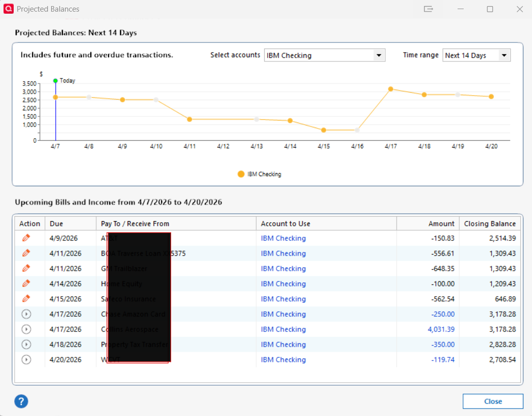 I am using Quicken Classic Deluxe R66.28 for Windows 11. On the Main View - Monthly Bills section, the projected Balance amount is often incorrect. When I click the tab for See Projected Balances and filtered for my checking account - the starting Closing Balance matches the Register. But as I go down the list the math does not agree with the Closing Balance amount. One issue I did figure out in the Closing Balance amount will be the same for all lines with the same Due date (confusing). But after a deposit amount, the Closing Balance amounts can't be explained and are way off. See Attached screenshot. I have noticed this for months in many diff versions.