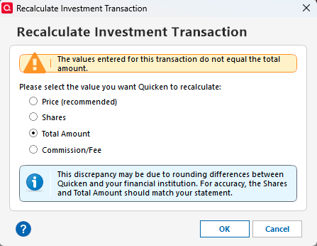 Of course the best thing would be to conform every single transaction in the Quicken Account with the broker.