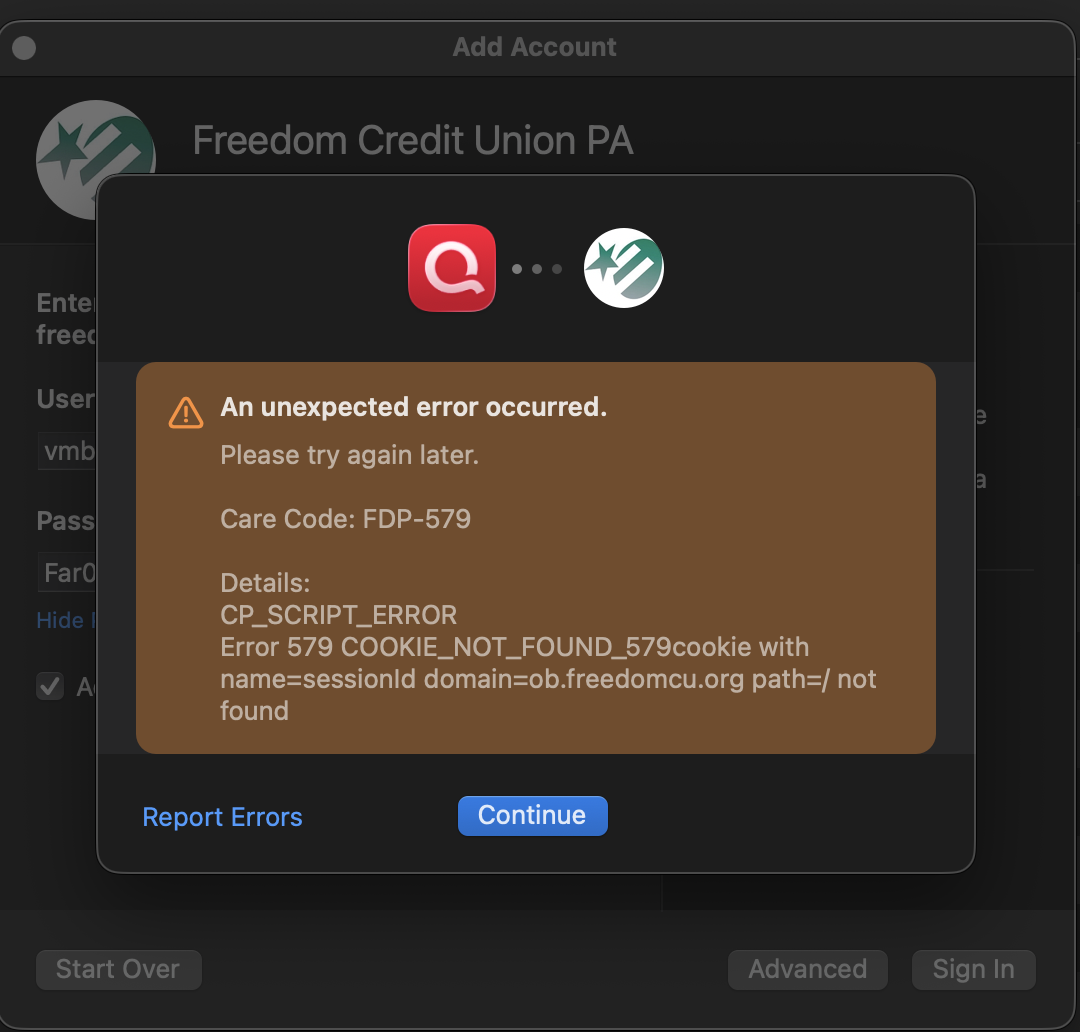 Thanks for posting these details. The FDP-579 error falls under Quicken’s Financial Data Platform (FDP) connectivity errors, which generally mean Quicken is being blocked from connecting to the bank on the bank’s side.