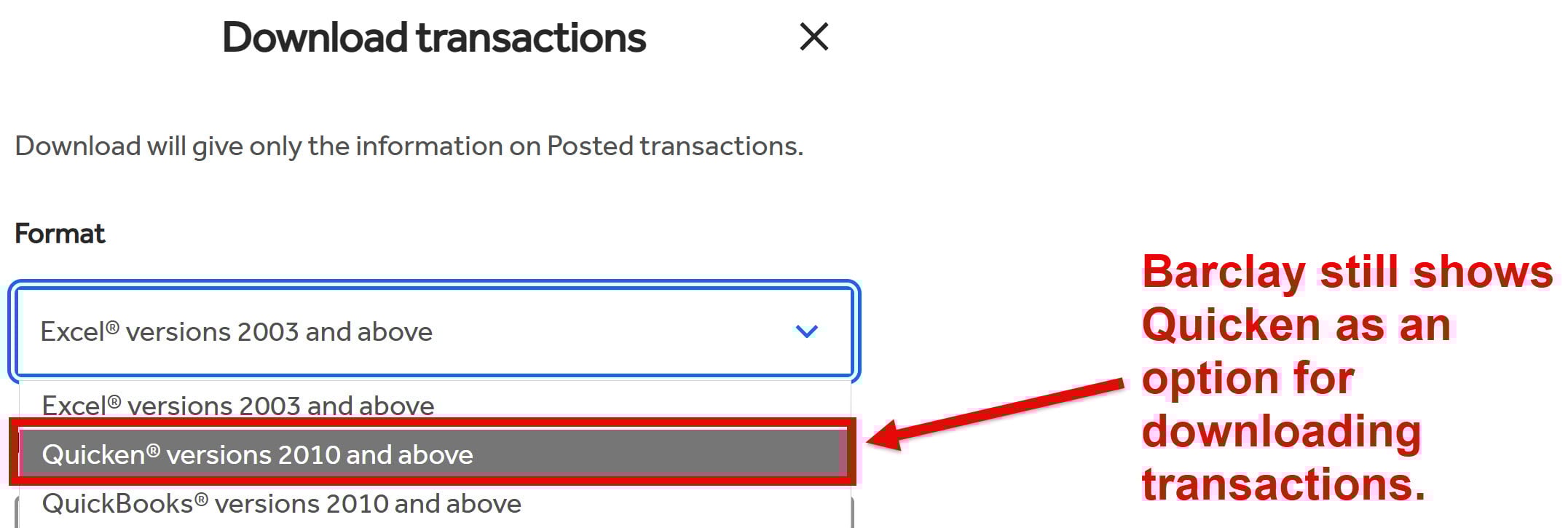 I called Barclays customer support twice, and both times I was told they know nothing about the problem. If they no longer support downloading transactions in a QFX file, why is "Quicken 2010 and above," which is QFX, still one of the options on the Barclays website? Are they familiar with the concept of "change management"? Asking for a friend… ;-)
