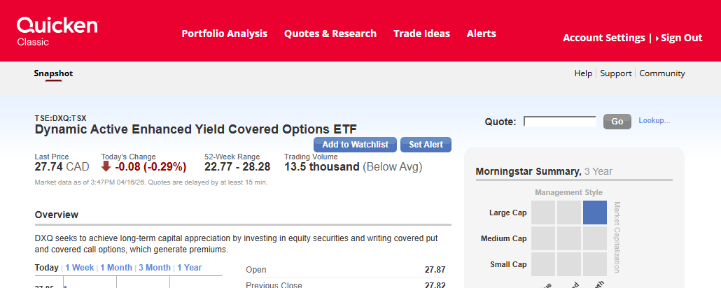 Not sure what to say. With my Quicken-US, TSE:DXQ shows up when I Add Security. I am not setup for multiple currencies, so I don't know if I am seeing CAD or USD pricing (probably CAD, which would miss the exchange rate if I bought some). I know Quicken CA is problematic sometimes with securities on different exchanges.