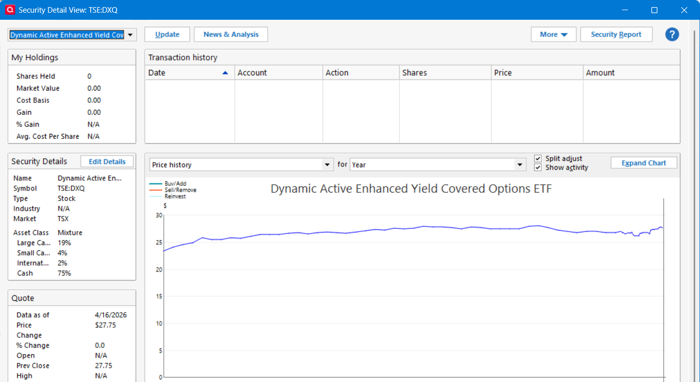 Below is the ETF. I ahve added an ETF type to my Quicken. I treid to find the ETF with the name and with the symbol and with TSE:DXQ