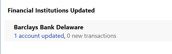 Our escalation team has confirmed that a fix has been released for the Barclays Bank Delaware – Missing Transactions issue.Please try again to update your transactions and see if the issue is resolved. If everything is working as expected, please let me know so we can confirm the fix is successful for your case.