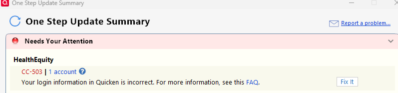 This is a common error when a financial institution has changed something regarding access via Quicken and they no longer recognize the log in that has been successfully used in the past. I think it is a pretty good indication that it is related to the message another user received from HealthEquity::