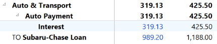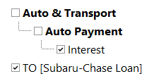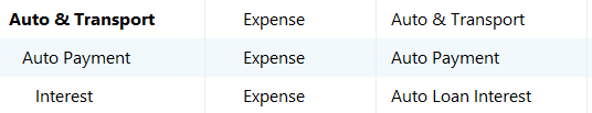 Not sure what exactly I did during setup but I'm hopeful someone can provide a suggestion related to getting the budget report to NOT show the interest portion of the auto loan in both the parent "Auto Payment" and then again in "Auto & Transport" rows. I thought about deleting the Auto & Transport Parent but wasn't sure what that would do. All financial tracking is accurate beyond this issue. I've list the category listing and the budget setting for this as well.
