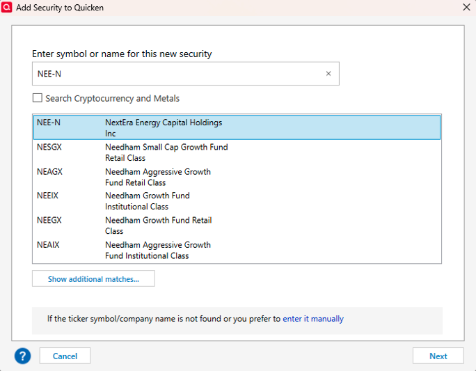 • In the account register, edit affected transactions and change the Security to assign them to the correct ticker (NEE or NEE-N)