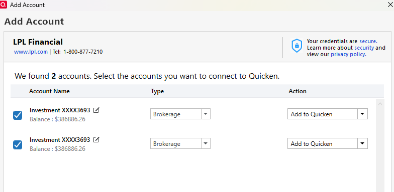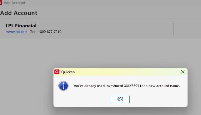 My wife just opened a retirement brokerage account at LPL. I went through authorization for access and validated it in a web LPL.com session. I have no other accounts at LPL in Quicken (I looked at all accounts and hidden… no LPL)