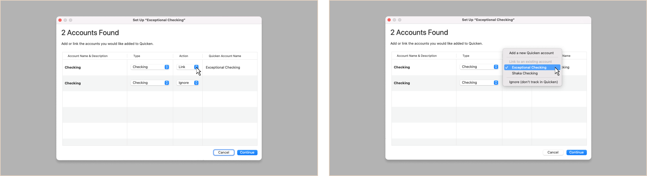 - When Quicken has returned all accounts discovered for this FI, very carefully LINK each of the found accounts to the appropriate account you already have set up in Quicken.