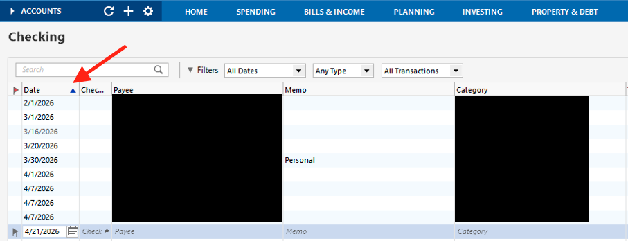 If you haven’t tried this yet, I recommend clicking on the Date column and confirming that the blue arrow appears next to it. This indicates that the transactions are sorted by date.