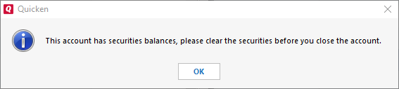 I'm trying to close permanently historic dead investment accounts. I keep getting an error attached. I've tried multiple ways to remove shares to zero them out, and nothing seems to work. What's the workaround or method to close these out?