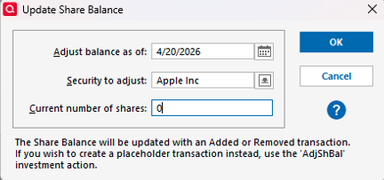 Thanks for your VERY helpful response! I get the principle: zero out holdings. I'm using an ancient desktop version from 2020 so the UI results differently clicking on the gear icon — isn't showing "update share balance." But I figured it out. Took some back and forth, but got it done! Perhaps soon I'll have to change my user name, LOL. I do have one other post in here that you may be helpful if you wouldn't mind taking a look at it, assuming you work for Quicken.