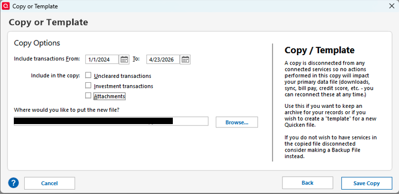 Important: After creating a copy with a limited date range, you’ll need to reconnect and relink any accounts if you download transactions.