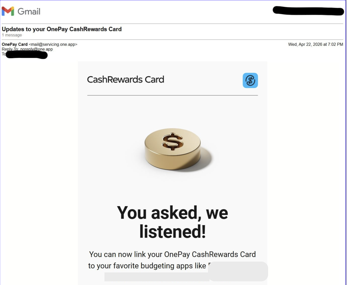 I received this email a few hours ago about my Walmart OnePay Cash Rewards Credit card from Synchrony Bank.