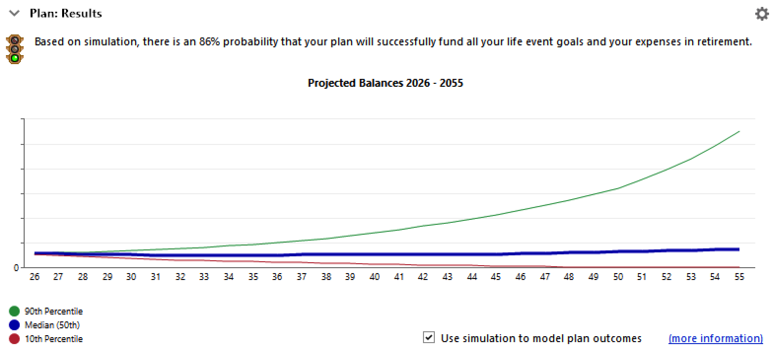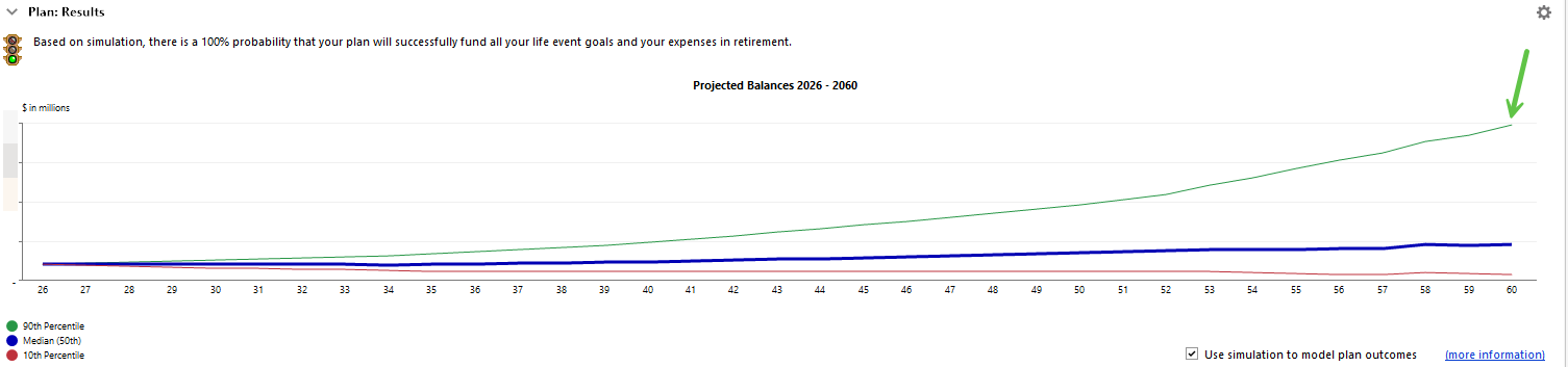 What a nice surprise - and well implemented. The 90/50/10 percentiles are industry standard and an excellent decision. Results are consistent with the excellent models available with Fidelity and Empower accounts, but Quicken is the only planner that adds future transactions to the user's current holdings for analysis.