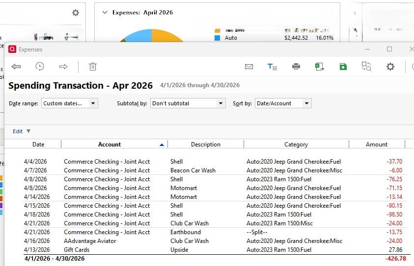 However, if I click the graph and do a report of my Auto expenses, Quicken reports only $426.78 month to date.