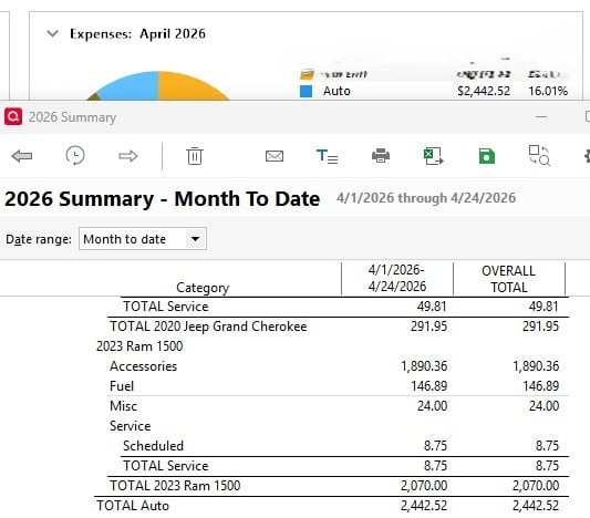 April month to date expenses shown in screenshot are $2442.52 on the graph as well as a month to date summary report. All good.