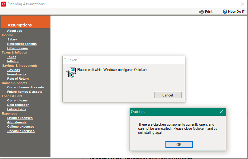When I launch Quicken after running the R67.7 Mondo Patch, back come prompts such as below if I 1) try to Change Assumptions in the Lifetime Planner or 2) open the Tax Planner: