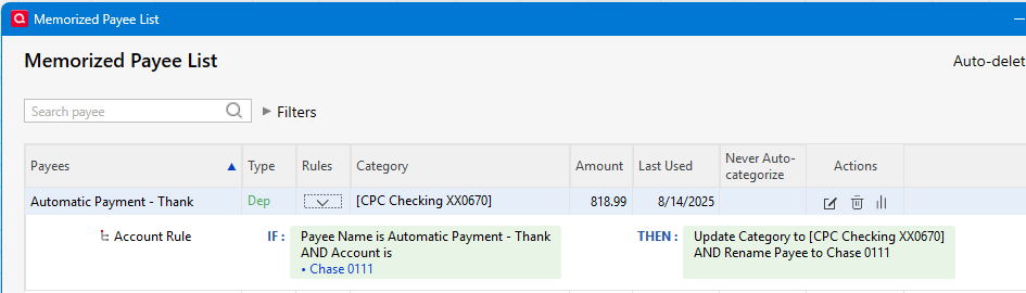 - Up until recently (and the reason I switched practices) memorized payees couldn't be used for this purpose because all memorized payees were global. Say you setup a memorized payee with the idea that it would be a transfer from your checking account to your credit card account. You set it the reminder in the credit card account with a category of [checking account]. And the payee is the same in both accounts. Well, if both transactions download at the same time, you don't know which Quicken is going to process first. If Quicken sees the payee in the checking account, it would in fact use [checking account] for the category because that is what the memorized payee says to do. Recently though they added the ability to restrict a memorized payee to a given account (see the memorized payee list for changing this). This has been my approach for a while, and it has been working pretty well.
