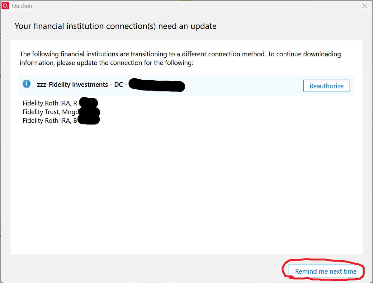- Reauthorization: Worked well and Quicken linked the download correctly to the account in Quicken.
